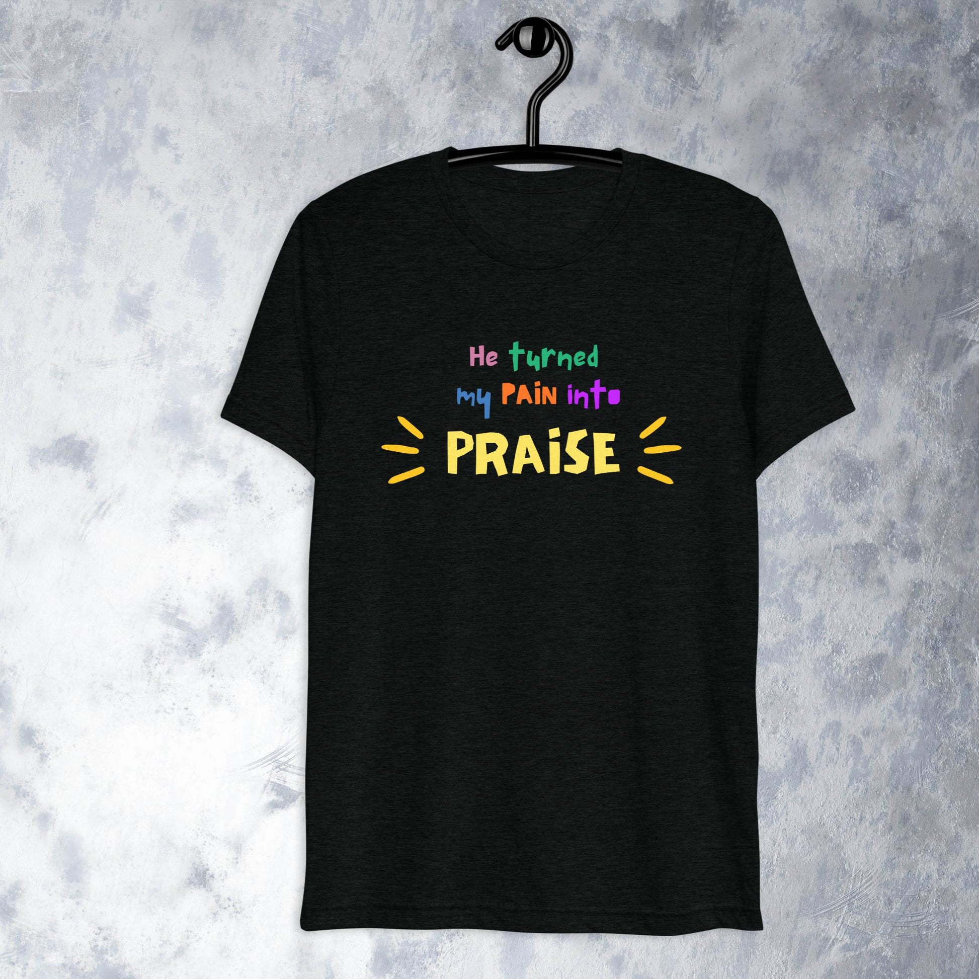 Introducing our "He Turned My Pain Into Praise" T-shirt, a powerful testament to transformation and faith. This shirt supports The Revolution Church and Celebrate Recovery, celebrating the journey from struggle to triumph. Made from premium, soft fabric, it's perfect for everyday wear and spreading a message of hope and renewal. Wear it as a reminder of the strength and healing found in faith.